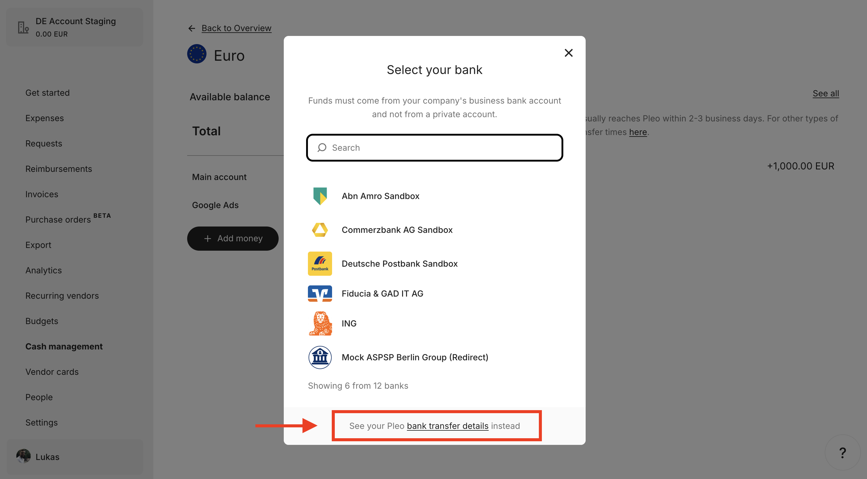 - Gehen Sie in der Pleo-Web-Anwendung zu Cash-Management.